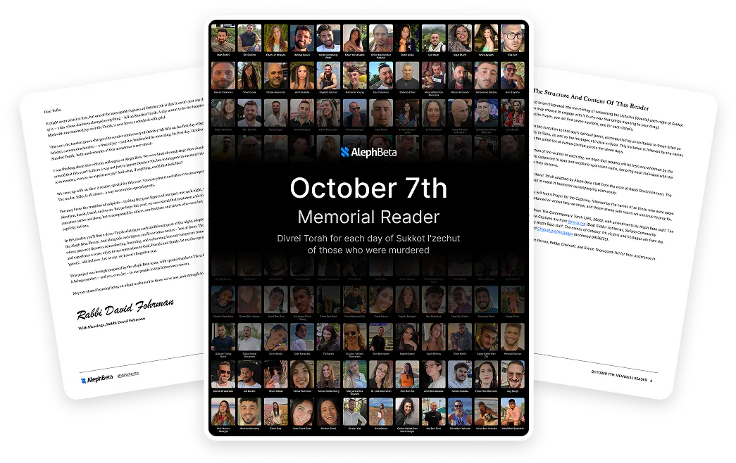 This year, October 7th falls on the first day of Sukkot. The Hebrew yahrzeit is, as always, Simchat Torah. Is there anything more dissonant than the grief and the joy of this time? That's why we created this Memorial Reader. This unique reader builds upon the tradition of ushpizin by inviting not just our beloved ancestors like Avraham and David into the sukkah, but also the souls of those we lost on October 7th. Print it out, learn from it each day, and let their memory be your most honored guests.