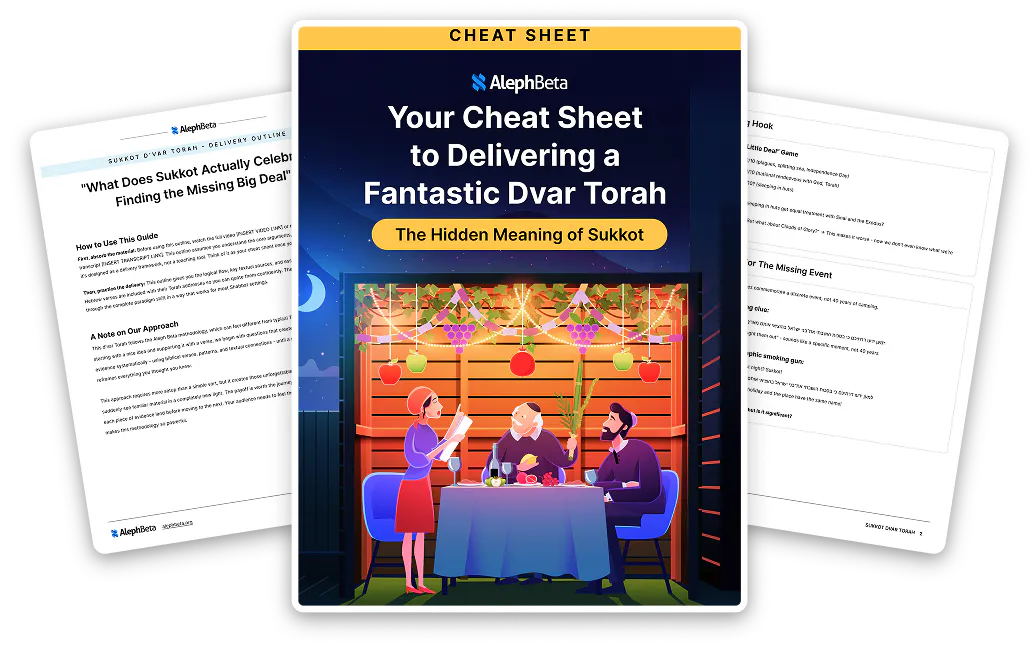 Want to give a dvar Torah this Sukkot - but could use a bit of support and a burst of confidence? We’ve got your covered. With our Cheat Sheet in hand, you’ll impress your family and friends, and share the kind of deep, engaging Torah insight that will get everyone talking, thinking, and connecting.