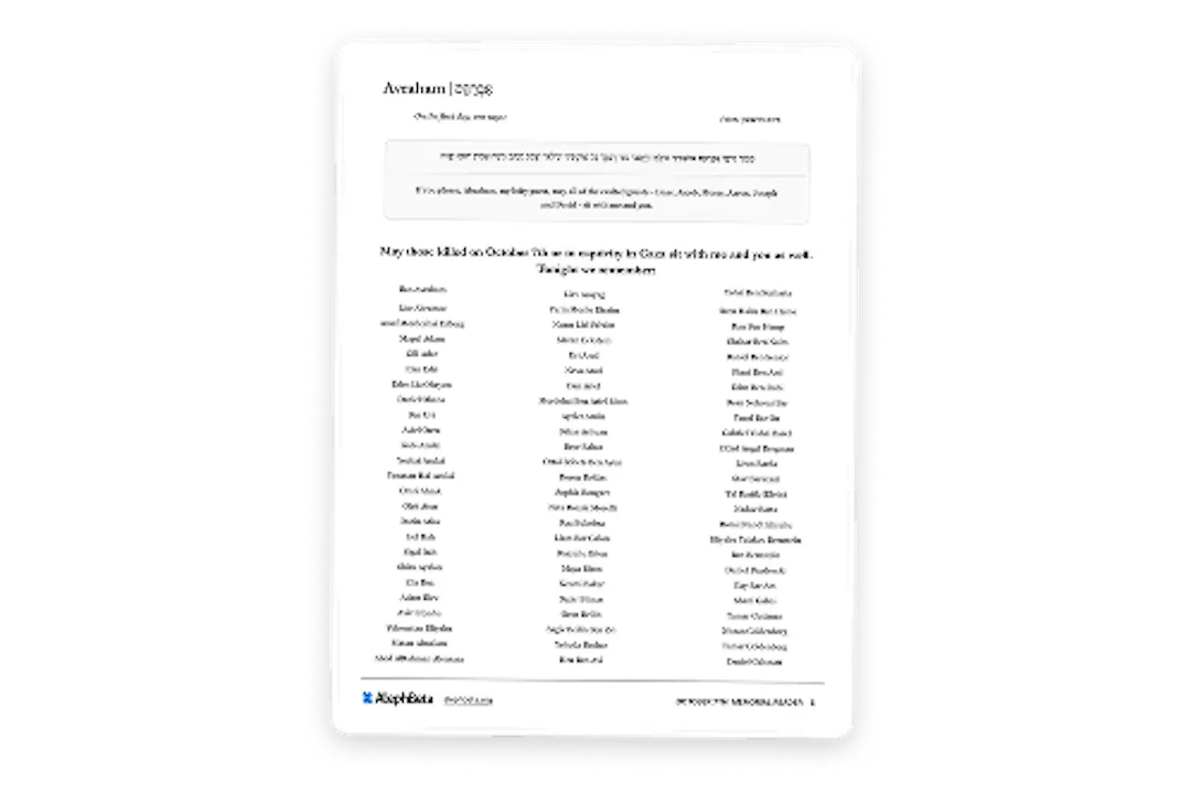 Each section of the Memorial Reader begins with the traditional invitation to that day's spiritual guest, accompanied by an invitation to those killed on October 7th or in captivity in Gaza, as well as the hostages still alive in Gaza. This invitation is followed by the names of individual victims, with the entire list of names divided across the seven days.